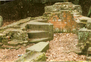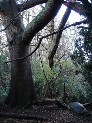 St Olaf's must have been a jewelcase of a chapel with its carvings, chancel, pulpit and spiral stone staircase up to the tower which overlooked the Bollin Valley. Little enough remains. As the yews have grown so has the chapel shrunk, victim of vandals and neglect. Just a couple of courses of stonework remain and the foot of the spiral staircase. It should be noted that, following immemorial convention, its axis is East-West, the rising sun piercing the chancel window.