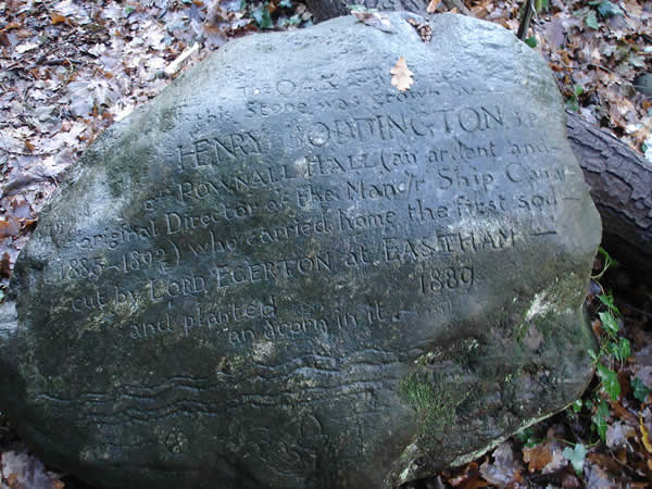 "The oak tree near this stone was grown by Henry Boddington, J.P. of Pownall Hall, an ardent and original Director of Manchester Ship Canal 1885-1892 who carried home the first sod cut by Lord Egerton at Eastham in 1889 and planted an acorn in it."